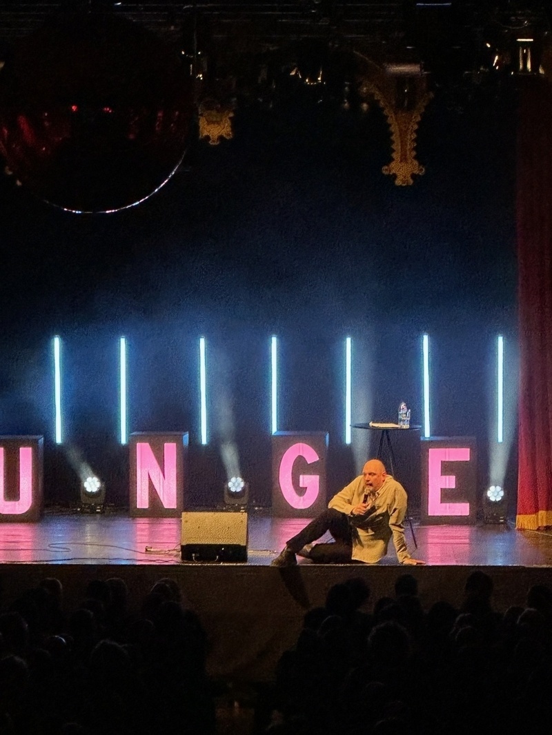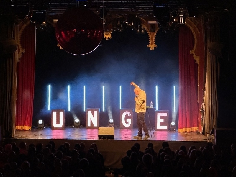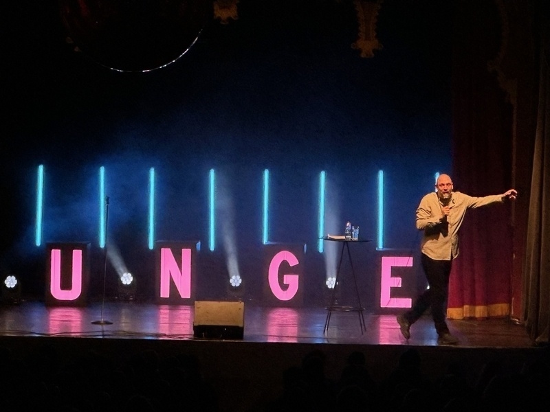 Har framgången stigit Jonatan Unge åt huvudet? Nej, under premiären av hans första soloturné drar publiken en suck av lättnad: Unge spränger fortfarande absurdismens gränser för vad man får göra och hur man kan bete sig här i livet, skriver Niklas Wahllöf.